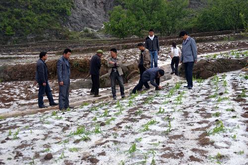 5月7日,工作人员在贵州省威宁县金钟镇冰雹灾害现场查看灾情。