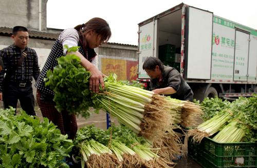 5月7日,四川省成都市双流县永安镇三新村华岗蔬菜种植专业合作社的社员,在为社区居民配送刚采收的新鲜蔬菜。新华社发(邱海鹰 摄)