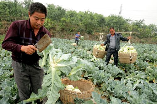 5月7日,四川省成都市双流县华岗蔬菜种植专业合作社的社员在田间为社区居民采收新鲜蔬菜。新华社发(邱海鹰 摄)
