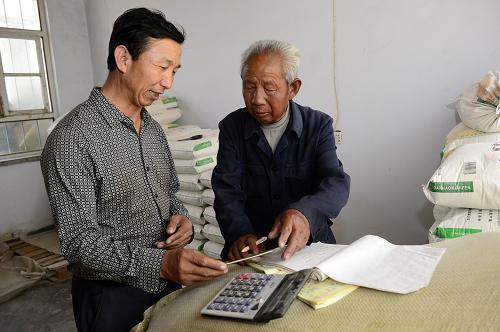 宁夏青铜峡市种粮大户李治平(左)在“粮食银行”兑换点查看粮食兑换信息。