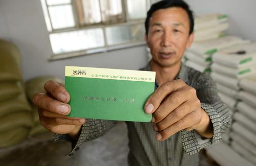 宁夏青铜峡市种粮大户李治平在“粮食银行”展示粮油储存兑换一本通。