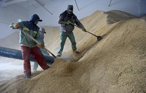 青铜峡市中航郑飞塞外香公司工人在代储粮库整理粮食。