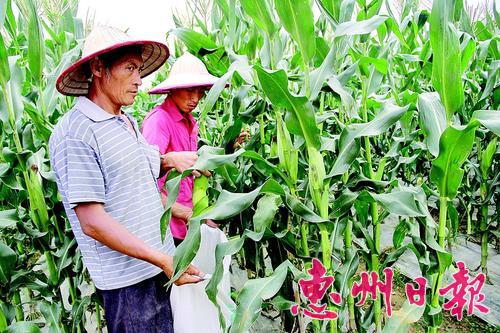 惠阳区平潭镇村民日前在田间采摘甜玉米,这些甜玉米将会运到惠城、深圳等地销售。据悉,今年惠阳第一造甜玉米田头收购价从去年底的2.6-2.8元/公斤涨至4-4.2元/公斤,市场零售价10-12元/公斤。