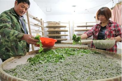 湖州市农村春蚕已开始进入三龄饲养管理期,为了今年有个好收成,蚕农们正进一步加强春蚕饲养管理。图为德清县新市镇栎林村蚕农陈坤祥,正在蚕房为蚕宝宝添加鲜桑叶。
