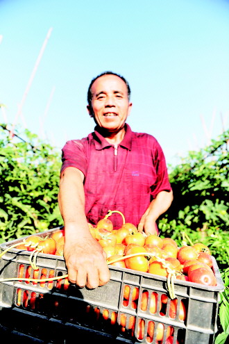 提起一筐满满的西红柿,李永章脸上洋溢着丰收的喜悦。