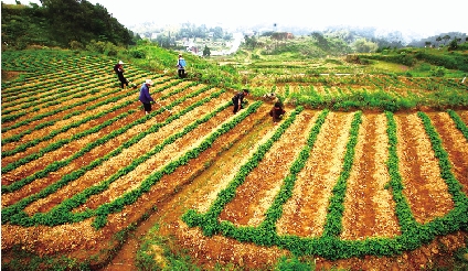 5月14日,马屿镇下徐村村民在大南山梯田里对太子参进行除草、病虫害防治等田间管理。该村今年1月份种下的200多亩太子参已高10多厘米,丰收在望。