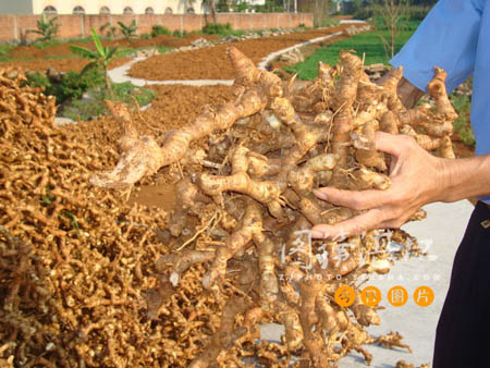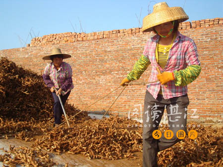 炎夏烈日,正是高良姜收获上市的好时节。笔者在徐闻县农村看到,在水泥村道中,村民正堆积成山的新鲜高良姜摊平分散,扩大暴晒面积,充分吸收阳光。