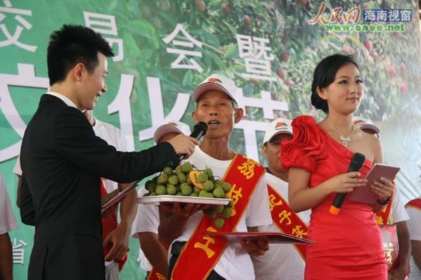 18日上午,来自琼山区三门坡镇谷桥村委会60多岁老大爷梁振桐种植的妃子笑荔枝力克群雄,一举夺得本届荔枝王荣誉称号,他的获奖荔枝在情系雅安现场义拍会上,以3万元的天价,被海南琼珠海岸实业开发有限公司成功拍得。