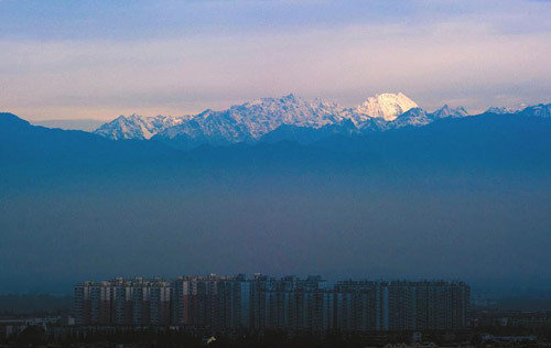 从苏坡立交附近拍摄的华西雨屏雪山(即西岭雪山)。(图片来源:华西都市报 陈羽啸 摄)