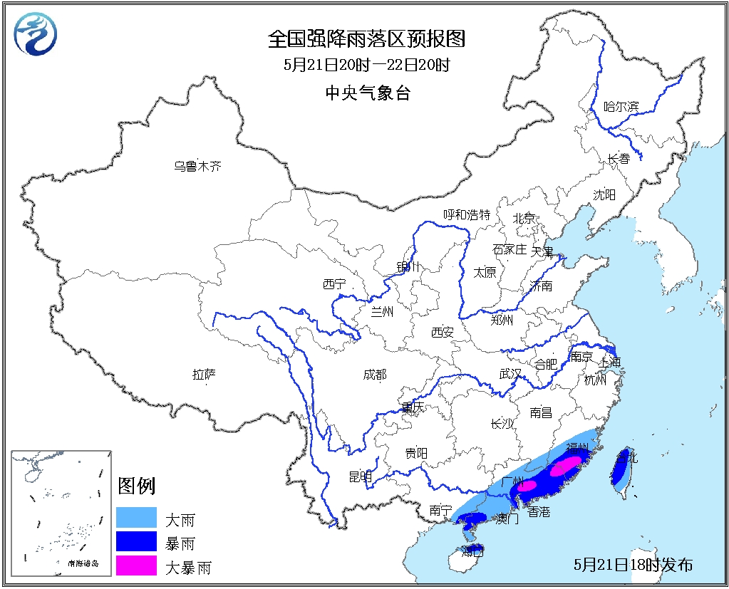 中央气象台5月21日18时继续发布暴雨蓝色预警: