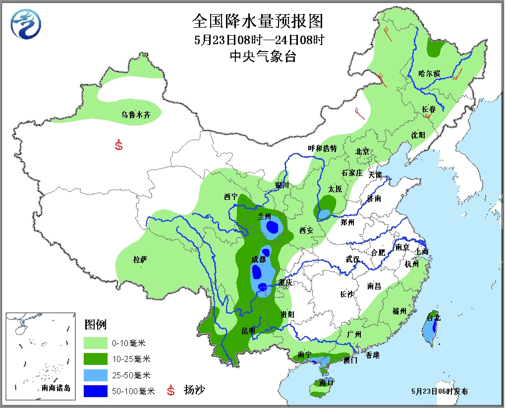 预计,今天开始,雨带将逐渐自西向东移动,雨势逐渐增强。23至24日,四川盆地、甘肃南部、陕西南部等地的部分地区有大到暴雨,其中,四川盆地局地有大暴雨(100~150毫米),上述地区局地并伴有短时雷雨大风或冰雹等强对流天气。