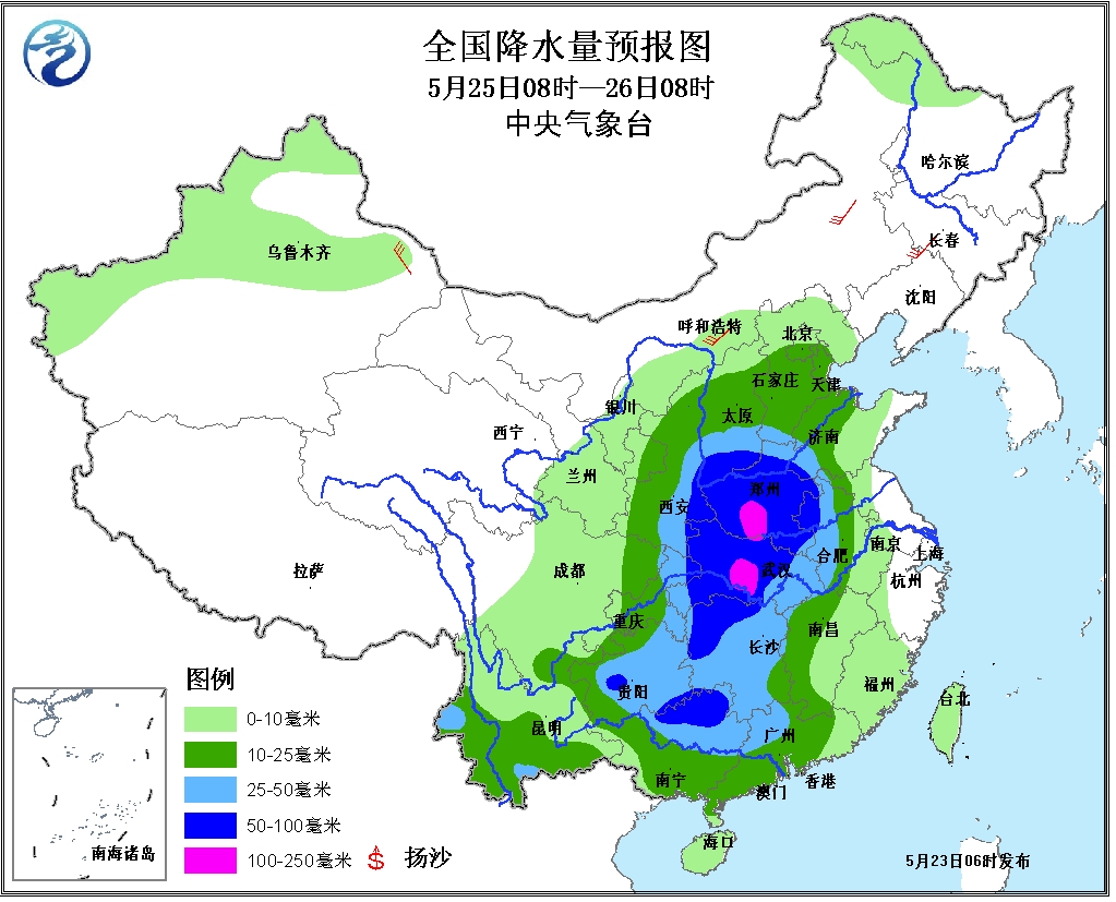 新农网讯 今天(23日)华南地区的强降雨开始减弱,但我国大范围的强降雨过程正自西向东拉开帷幕,此次降雨过程将持续至27日。其中25日至26日北方冬麦区将出现强降雨,局地有大暴雨,并可能伴有雷电大风冰雹等强对流天气;25日至27日,南方地区将出现4月28日以来的第五次大范围强降雨过程。此次降水过程影响范围大、降水强度强,部分地区地质灾害气象风险等级偏高。