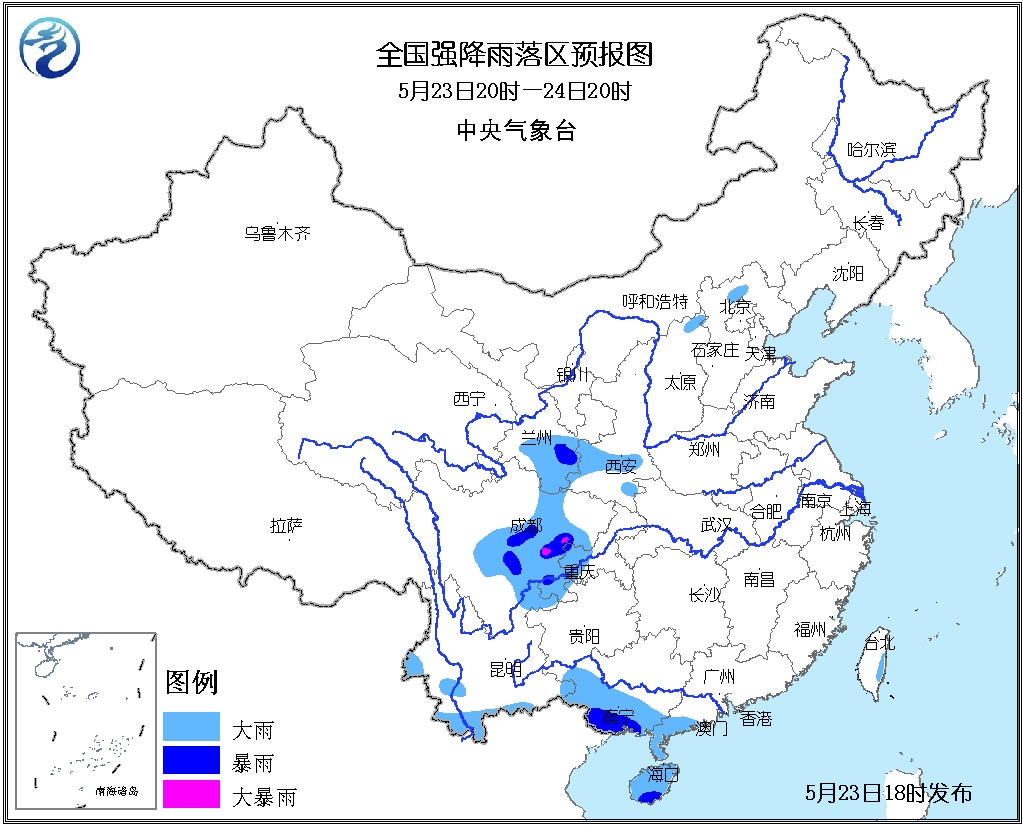 中央气象台5月23日18时发布暴雨蓝色预警: