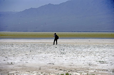 乌鲁木齐柴窝堡湖,大片的盐碱地包围着湖水。(文/晨报记者 赵梅 图/晨报记者 赵宇飞)