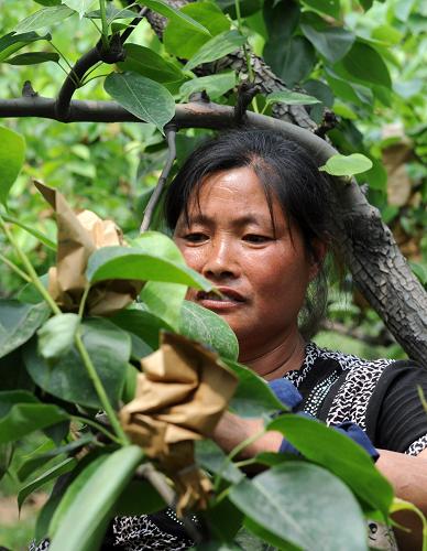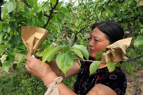 5月23日,在河北省泊头市梨园里,农民给鸭梨幼果“穿衣”。