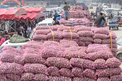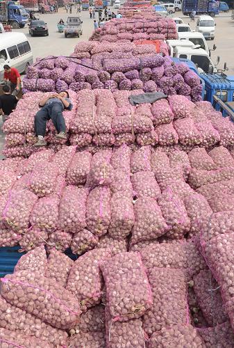 5月28日,在河南省中牟县的一个农产品交易市场,销售大蒜的车队排起长龙等待销售。