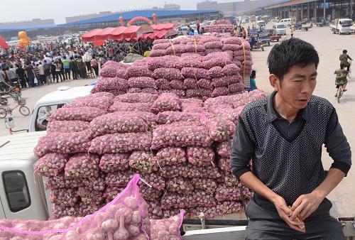 5月28日,在河南省中牟县的一个农产品交易市场,一名经营大蒜的商贩在车上观望。