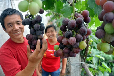 5月28日,在山东聊城市茌平县贾寨镇贾铁匠村,佳美果树种植合作社社员大棚葡萄种植户贾存征夫妇望着丰收的大棚葡萄乐的合不拢嘴。连日来,山东聊城市茌平县贾寨镇贾庄村63座大棚藤稔葡萄陆续丰收上市,市场批发价卖到13元一斤。每棚可收入葡萄6500斤以上,棚收入在8万元左右。吸引了济南、聊城等地的客户纷纷前来收购。