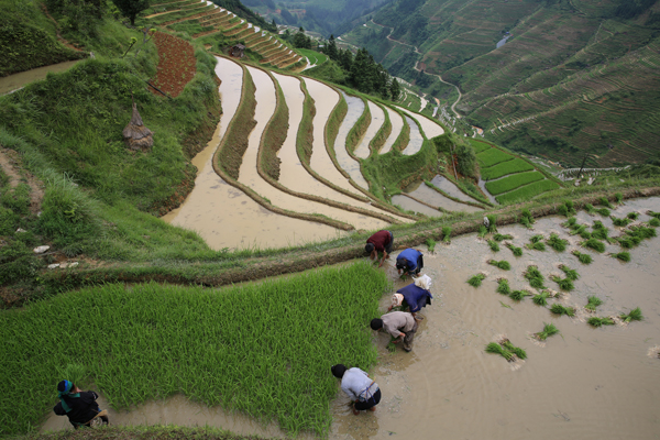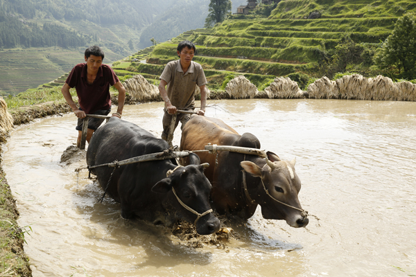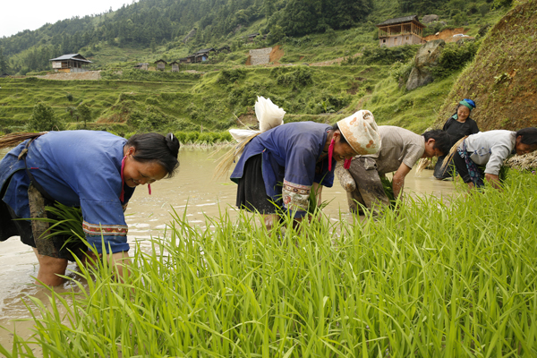 5月26日,榕江县计划乡加宜村村民在帮男劳力外出户耙大田。