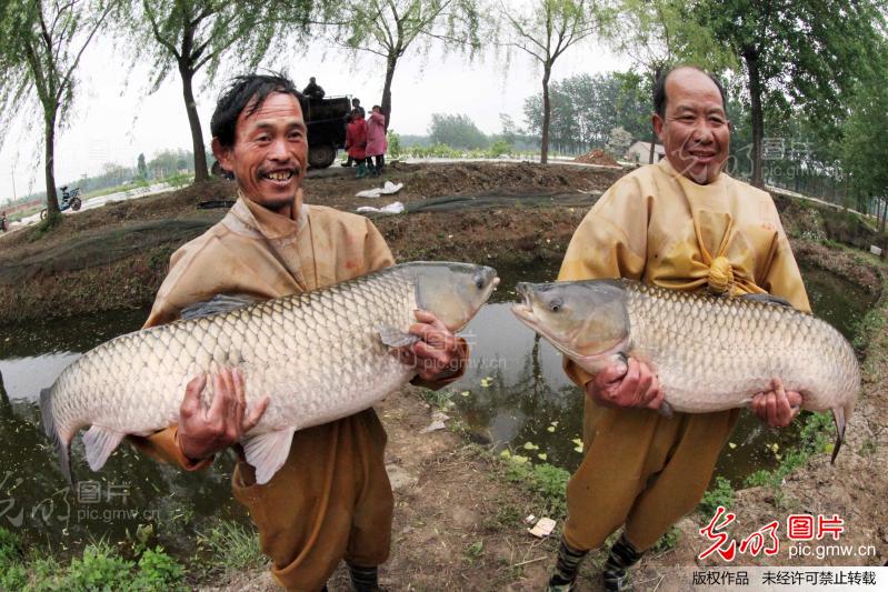 2013年5月15日,江苏省赣榆县班庄镇养殖户正在展示起捕的大鱼。