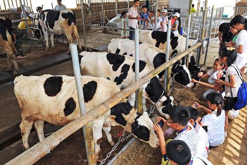 来自杭州的小学生参观浙江莫干山镇一家现代农业公司的奶牛养殖场(5月25日摄)。