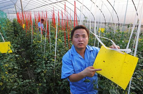 5月28日,浙江义远生态农业有限公司农技员崔云龙(前)在公司有机蔬菜大棚里介绍用黄色诱虫板“物理除虫”的方法。