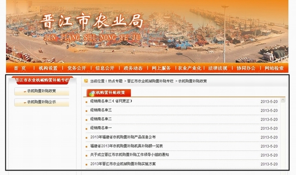 5月28日,晋江市农业局网站正式开通了《晋江市农业机械购置补贴专栏》,方便了广大农户和专业合作社查询和了解有关信息,并确保5年内能够随时查阅。