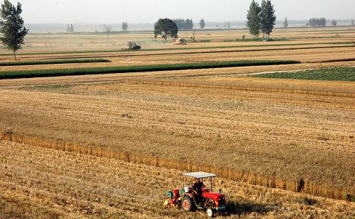 当日,陕西关中地区小麦收割工作全面展开。今年三夏期间,陕西大力推行机收和机播同步作业,共投入各类农机超过百万台,将完成1400万亩小麦机收任务和850万亩夏播任务。新华社记者 都红刚 摄