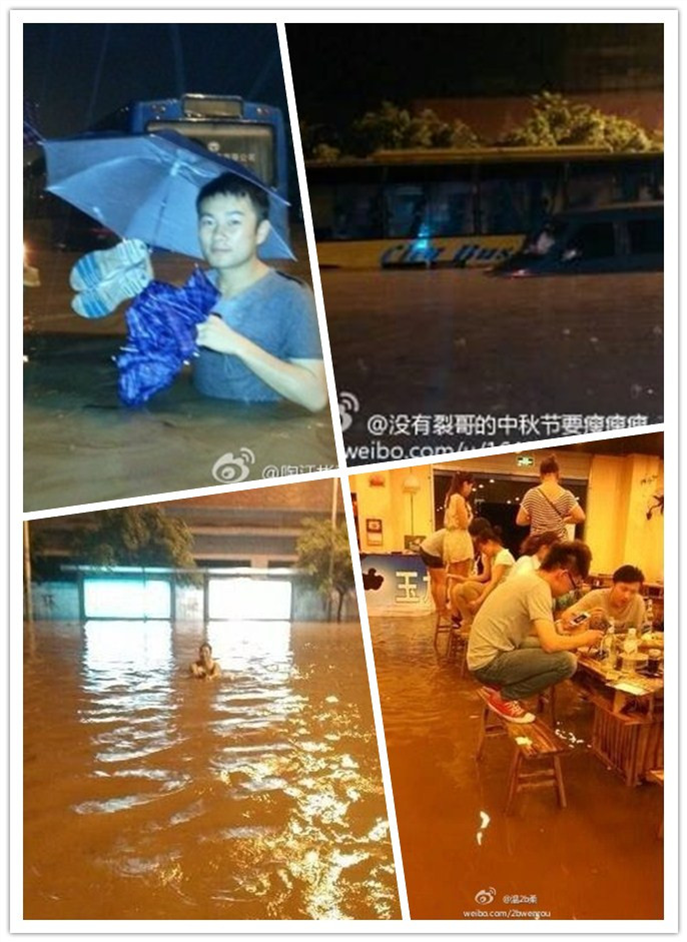 强降雨让陈家桥附近积水较深,有市民在公路上游泳,在一进水的店铺中,还出现淡定“火锅哥”。(图片来源:新浪微博)