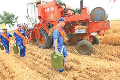 日前,中石化郑州石油分公司志愿者送油服务小分队来到荥阳市广武镇,为“三夏”田间作业的收割机提供加油服务。