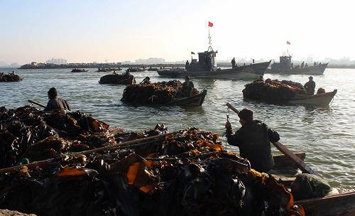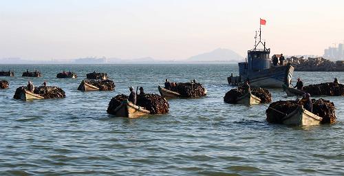 近日,山东荣成海带收获进入高峰期,晴好天气里,养殖工人们要从凌晨两点半一直忙碌到晚上七、八点钟,各港口呈现一派繁忙的“海上夏收”壮观景象。目前,荣成市海带收获已完成80%,预计7月初将全部收割完毕。