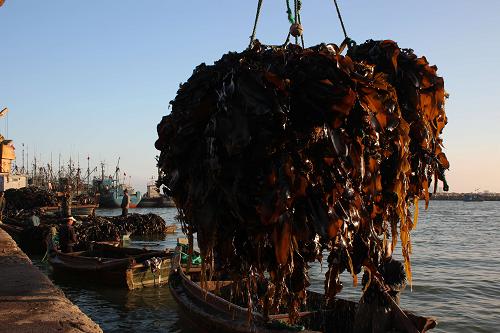 6月17日,在山东省荣成市蜊江港,养殖工人在装运刚刚收割的海带。新华社发(林海珍 摄)