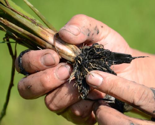 尽管烈日当空,室内气温高达摄氏三十七度,接到电话后,行评组仍然决定立即赶往溢水。下午四点左右,有关专家在农技中心人员和朱家湾村书记引导下,冒着火辣辣的太阳来到田间,只见几块问题严重的稻田,稀疏的秧苗如“秃头”一般,有的秧苗已呈片状矮化死亡。深入田间仔细查看,受害水稻嫩叶上有明显虫食的痕迹。拔起濒于死亡的秧苗洗去泥土观察,只见幼嫩的新根被完全破坏。当地农户告诉专家:“我这块田,水稻刚插秧时长得蛮好,谁知这段时间却越长越瘦小,眼见有的开始死苗,也不知道是虫还是病,真是急死人了。”在认真观察田间危害症状,仔细询问农户管理、施肥、打药等情况后,专家初步断定,造成当地水稻坐蔸死亡的罪魁祸首是稻水象甲。