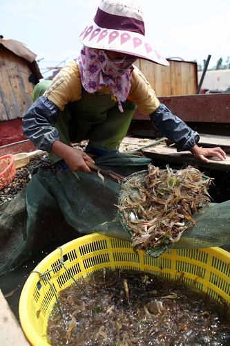 6月20日,在鄱阳湖江西都昌县城西码头,渔民展示刚捕获的虾。新华社发(傅建斌 摄)