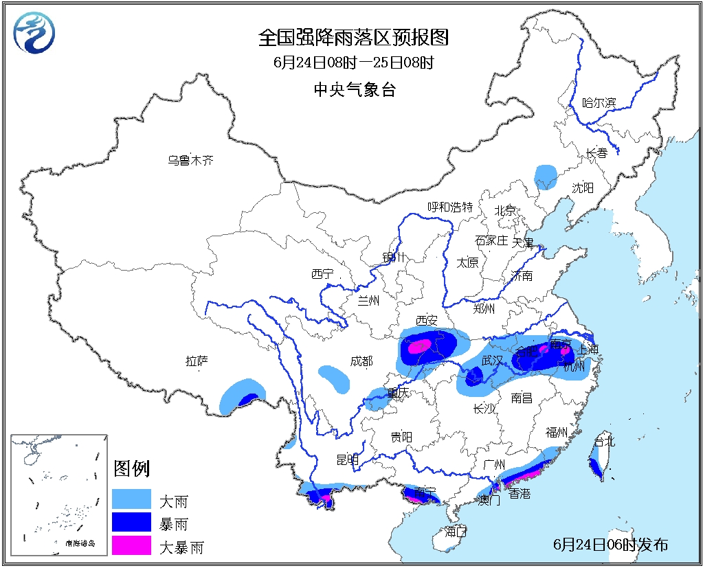 中央气象台6月24日06时继续发布暴雨蓝色预警: