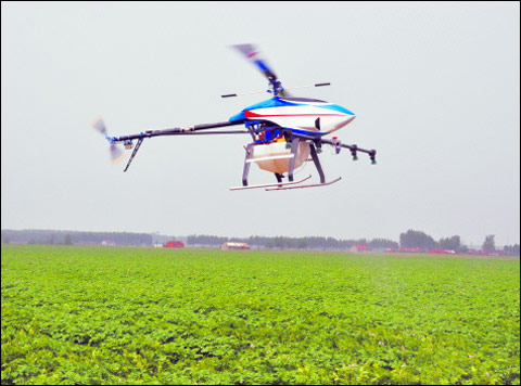 近日,青岛鸿飞农机专业合作社投入26.5万元,引进了青岛市农机系统首架单旋翼植保作业无人机。无人机通过使用远程操控技术进行喷洒农药作业,用于农作物病虫害防治,使重大病虫害防控水平大幅提升。