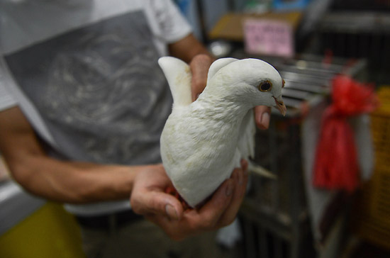6月20日,杭州某农贸市场内一名摊主展示待售的鸽子。