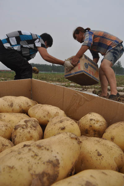 6月20日,山东聊城市茌平县集萃园农民种植专业合作社社员在抢收成熟的土豆