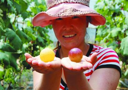 “这是滕稔葡萄,紫黑色,果粒大,平均粒重16克左右,形似乒乓球,俗称”乒乓“葡萄。”正在打理大棚的果农陈艳华揪下一颗葡萄,拿来乒乓球比较了一下,果然一般大小。