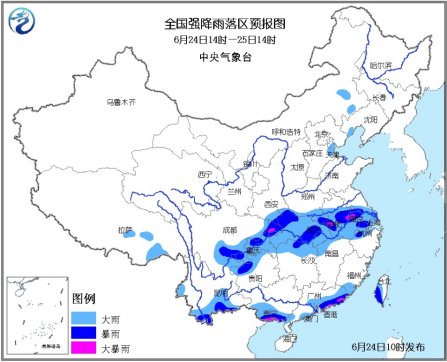 中央气象台6月24日10时继续发布暴雨蓝色预警: