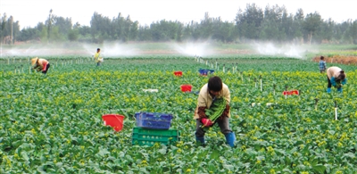 6月18日,青铜峡市瞿靖镇蒯桥村供港蔬菜基地,人们正在采摘芥蓝等叶菜。2009年,拥有香港蔬菜市场40%份额的深圳合创进出口公司进驻青铜峡市,流转3500亩土地,采用绿色种植、净菜加工、真空包装的标准化生产技术,示范种植供港蔬菜。目前,青铜峡市供港蔬菜种植面积突破万亩,年产值达4000多万元。
