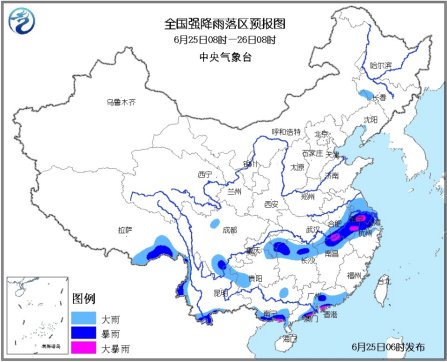 中央气象台6月25日06时继续发布暴雨蓝色预警: