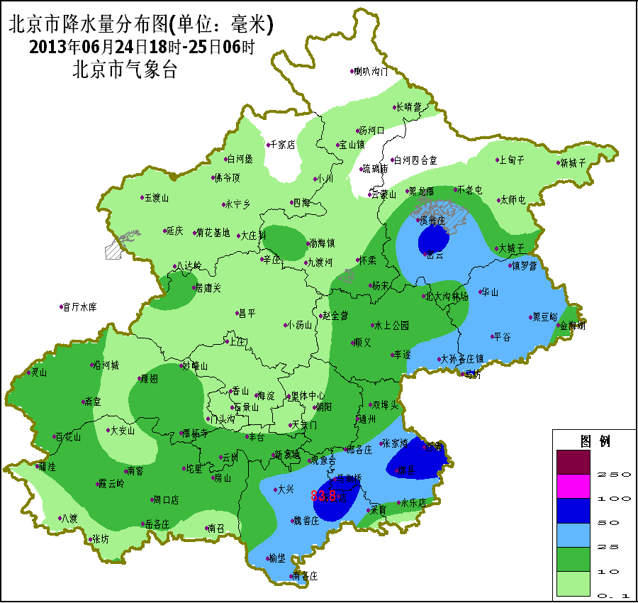 截至25日06时,北京东北部平均降雨量19.5毫米,东南部平均30.4毫米,全市平均降雨(气象+水文)13.0毫米,城区平均(气象+水文)8.0毫米;最大降雨出现在大兴长子营83.8毫米,最大雨强出现在大兴长子营20至21时的1小时内降下83.7毫米降雨。