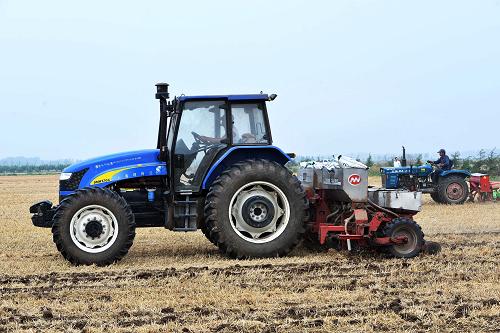 6月24日,山东省即墨市普东镇农民在秸秆粉碎后的麦地上机械播种玉米。新华社发(宁友鹏 摄)