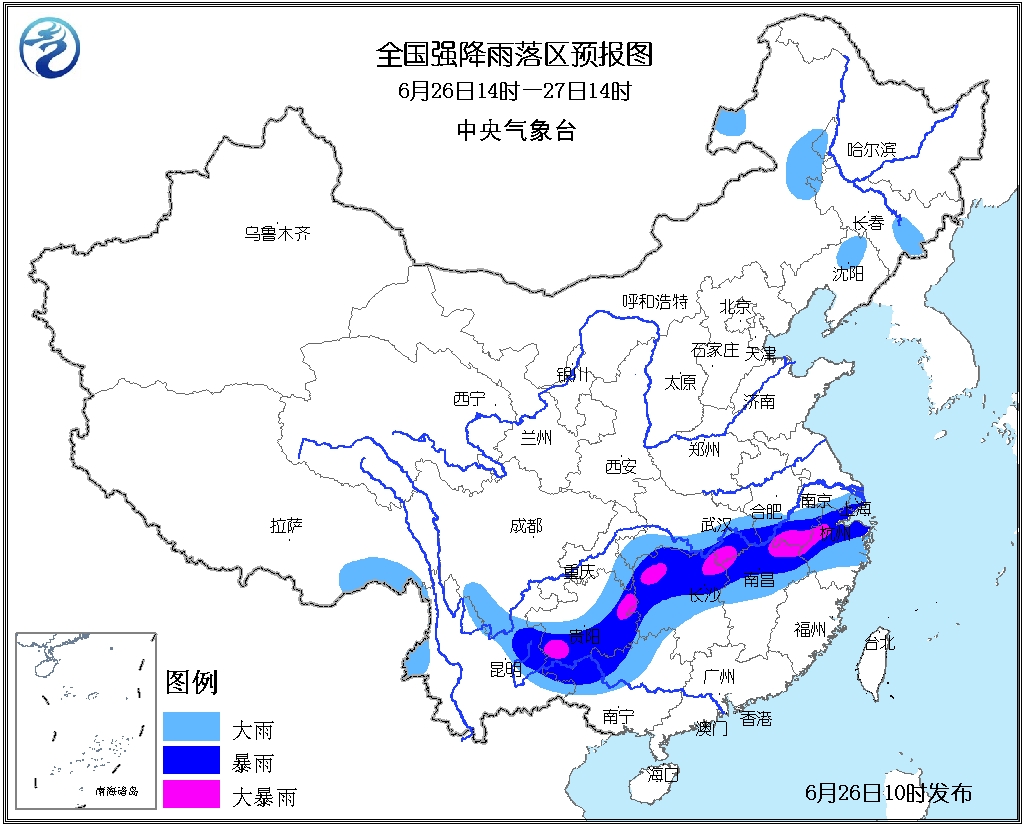 中央气象台6月26日10时继续发布暴雨黄色预警: