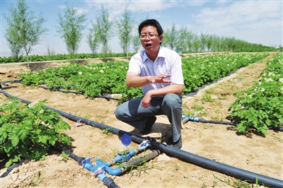 6月23日,在同心县王团镇宁夏旱作节水高效农业科技园,宁夏水利科学研究院副院长鲍子云在做马铃薯高效综合节水灌溉与雨水利用技术试验。目前,科研人员已探索出马铃薯高效综合节水灌溉技术,可使旱区马铃薯种植实现节水40%,产量翻一番。