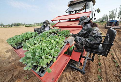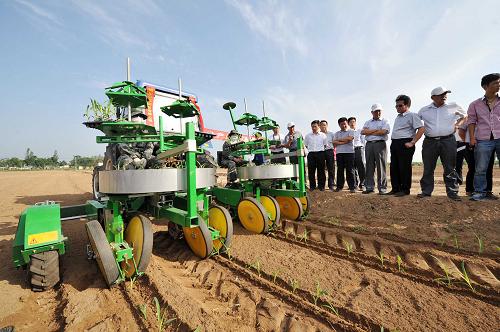 为了降低蔬菜与玉米的种植成本,提高种植效益,从2011年起,宁夏回族自治区在石嘴山市惠农区、平罗县、青铜峡市、吴忠市利通区、银川市永宁县试点示范蔬菜、玉米机械化育苗移栽技术。目前,已完成近千亩的试验示范面积,机械化移栽较人工移栽亩节约成本50元每亩以上,增产5%以上,对稳定“菜篮子”和确保粮食安全具有积极的促进作用。新华社记者彭昭之摄