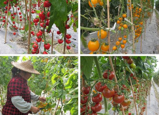 经测产,草莓型小蕃茄(红色)亩产2808公斤,单果重可达21.54克,夏日阳光(黄色)亩产2460公斤,单果重可达16.25克,CT27(橙色)亩产2030公斤,单果重可达32.5克,黑蕃茄(红黑色)亩产1956公斤,单果重可达34.3克。4个品种生育期、生产性状差异不大,口感好,甜度适中,是观光农业种植作物的上佳之选。