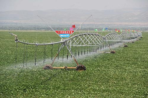 6月28日,在固原市原州区马铃薯种植示范园区内,大型节水喷灌设备在向农田里洒水。近年来,位于宁夏西海固干旱地区的固原市原州区大力推进设施农业产业,通过建设设施农业产业园区,带动当地生态移民实现产业致富。目前,全区设施农业累计建设面积达到11.2万亩,建成千亩以上设施农业产业园15个,实现时鲜蔬菜均衡生产。同时,生态移民户均一座温棚,棚均收入2.6万元到3万元,夯实了当地农户的产业致富路。