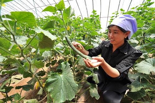 6月28日,在固原市原州区袁德移民新村的温棚内,村民在给大棚黄瓜除草,这里的大棚黄瓜每年能给当地农民带来2万多元收入。